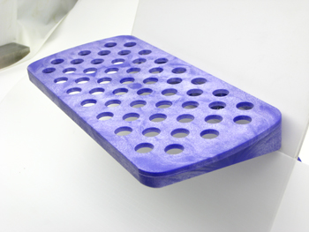 Accommodates 52 collets. Innovative design with an inclination of 8 degrees that deflects light for easy reading, Diagonal Hole pattern For easy collet access. Fits over any work station or flat surface, optional hanging bracket for wall mounting. Sturdy Styrene Plastic Material supports up to 30Lbs.